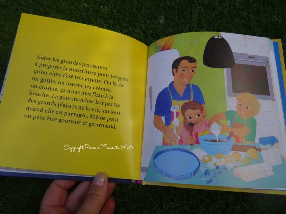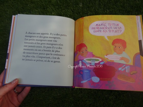 L’autre livre que nous avons à la maison aborde quant à lui le thème du repas… Car oui, parfois les enfants ne veulent pas manger, pour des raisons diverses et variées, ou veulent manger n’importe quoi, et le repas devient alors source de tensions… Ce livre explique tout simplement aux enfants l’évolution de la nourriture dans l’histoire, mais également d’un point de vue biologique. Il parle de l’importance de se nourrir, de la politesse également, de la gourmandise aussi, des sens, du grignotage, de l’importance de parler quand on ne se sent pas bien dans son corps, qu’on se trouve « trop gros » ou « trop maigre », de diététique (avec un tableau d’ailleurs plutôt simple pour les enfants), et de bien d’autres choses…